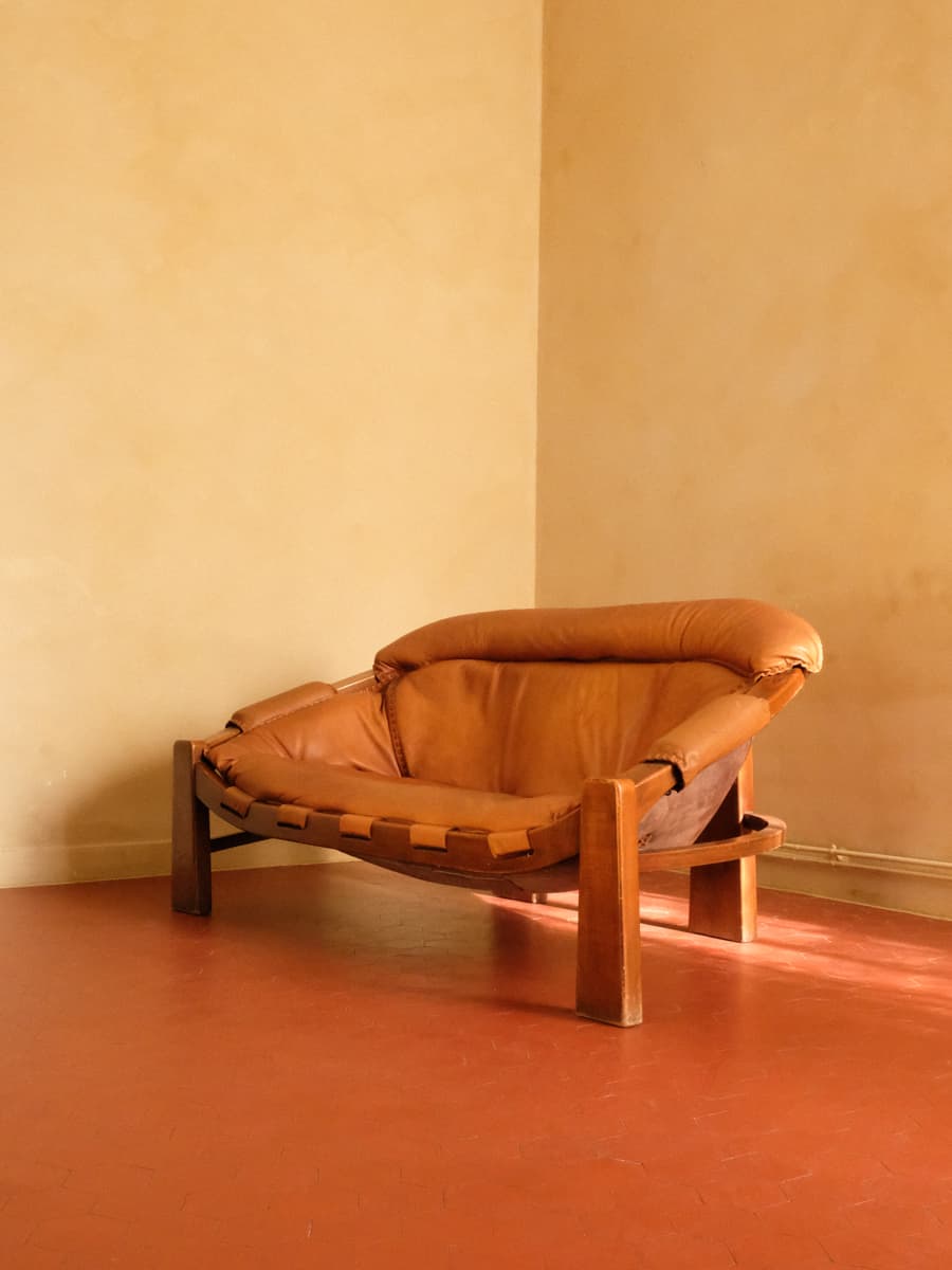 Italian sofa in camel leather made in the workshop of designer Luciano Frigerio (1928-1999), 1970s.