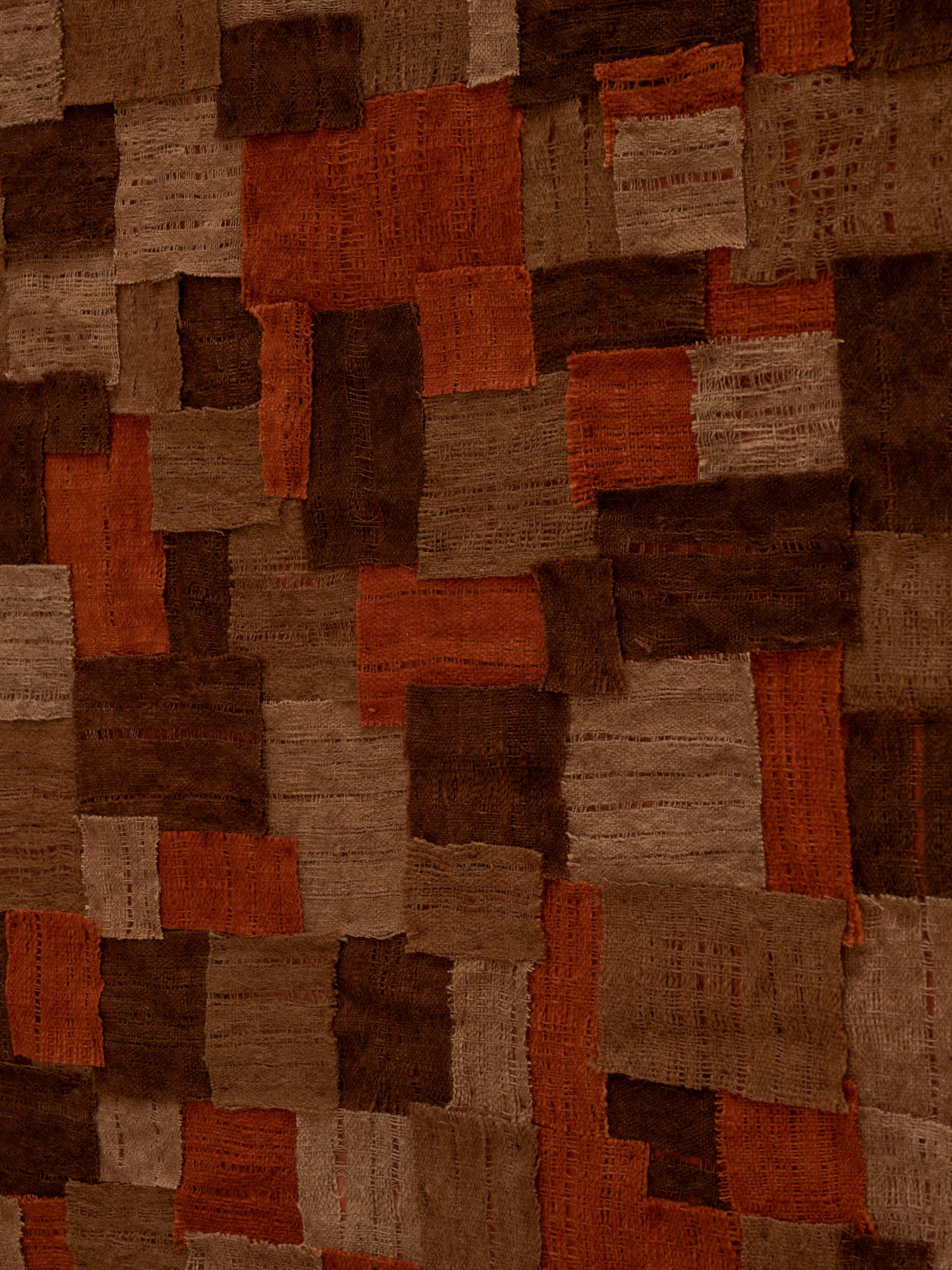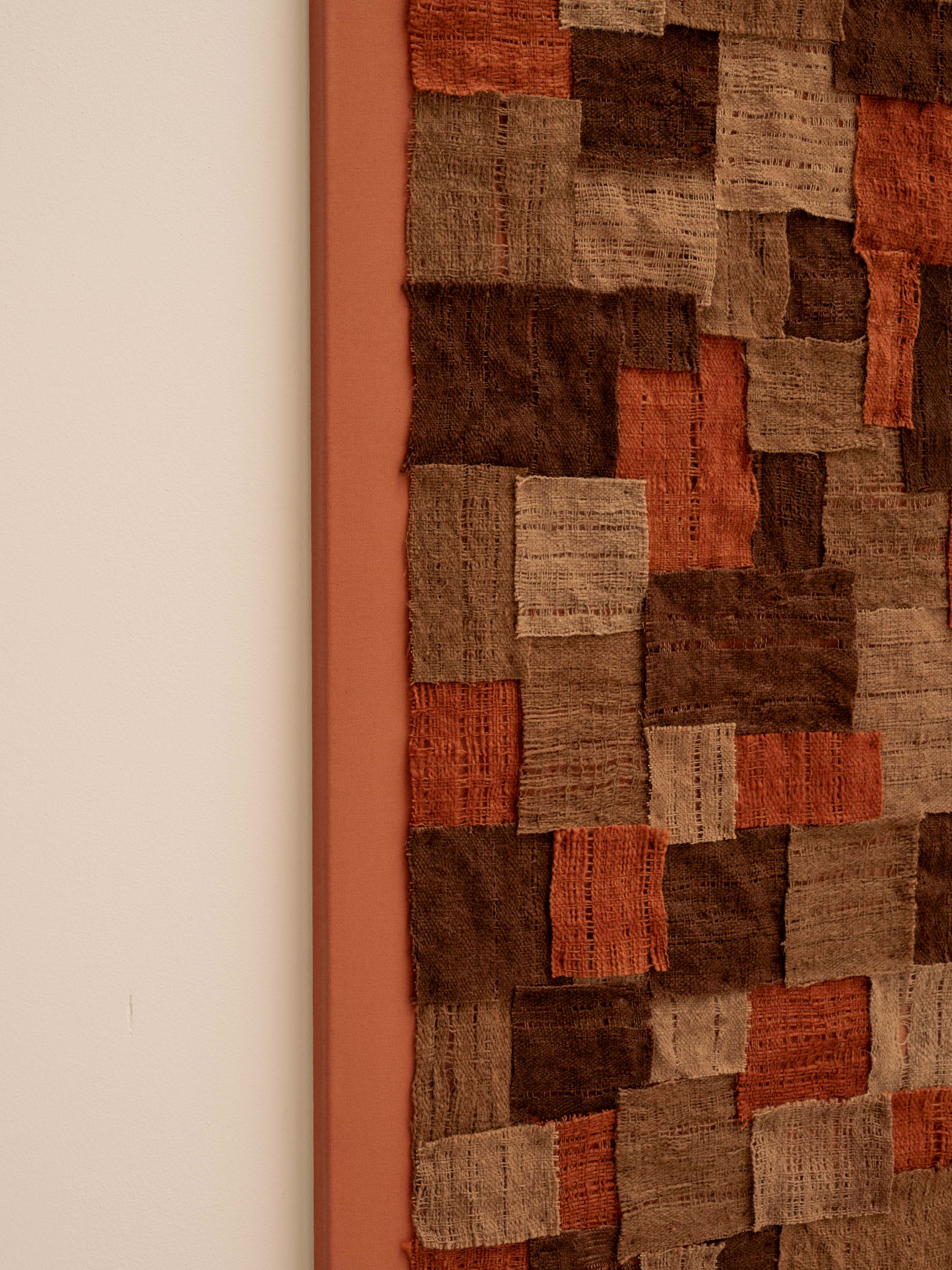 Finally, the pieces are sewn by hand onto canvas that has been pre-painted with natural ochres.